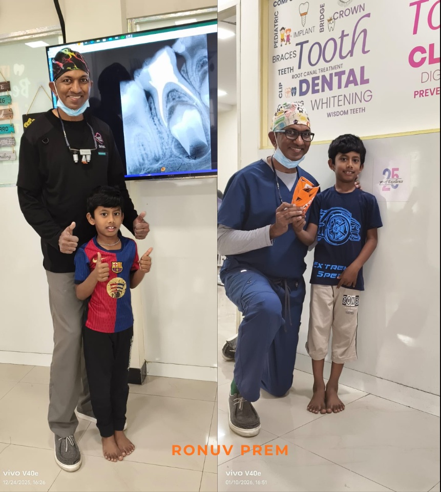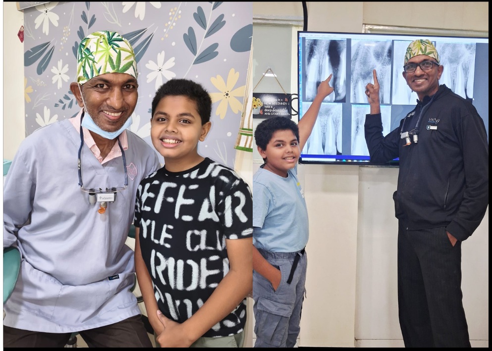 Arjun 11yr old brave, active boy Son of a Radiologist & Dentist . Super Charming Man in Dental Chair as well around . Athletic jumping boy who broke his permanent Upper Incisor when it has just landed his mouth ๐Ÿ˜ข.. very Co-operative charming boy. Always his Dentistry gets challenging in Science for us to get the results . Root Canal advanced to Root end Surgery.