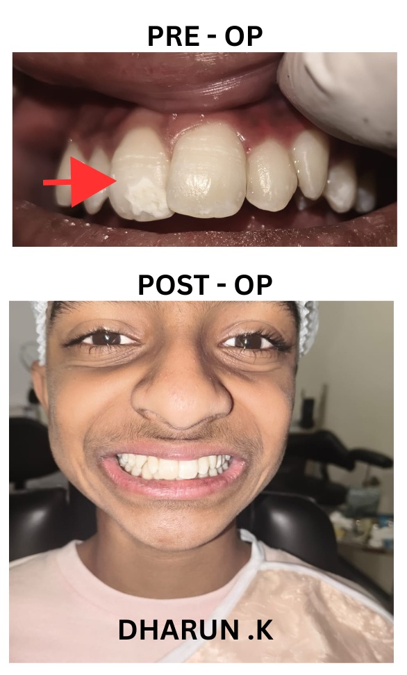 Dharun young boy had this ‘white patch spot ‘ lesion type inside the Enamel of Upper Incisor for quite a long time . His family Parents shifted to North as Dad was in Military๐Ÿ‡ฎ๐Ÿ‡ณ . Being their family Dentist during this Coimbatore visit Dr.Manikandan attended all his smaller Dental Decays as well did the Cosmetic work to the white patch to tooth color by Adhesive bonded Dentistry. All went good and they were happy ๐Ÿ˜Š.